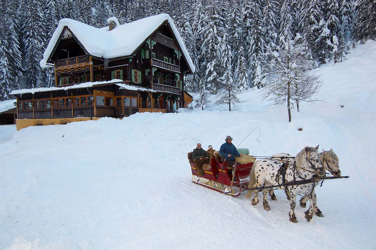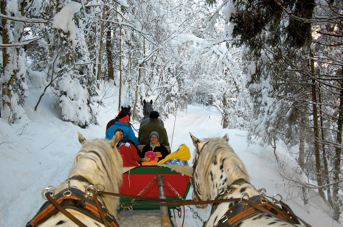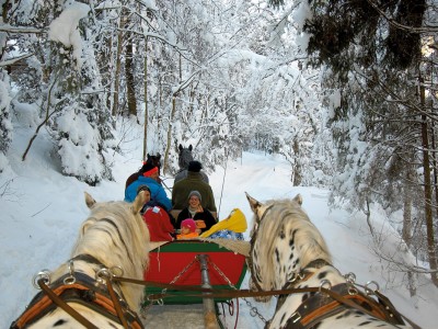 Dann unternehmen Sie doch eine Fahrt mit dem Pferdeschlitten. Die gemütlichen Vierbeiner traben dampfend durch die verschneite Winterlandschaft und bringen Sie ganz ohne Anstrengung zu entlegenen Zielen.