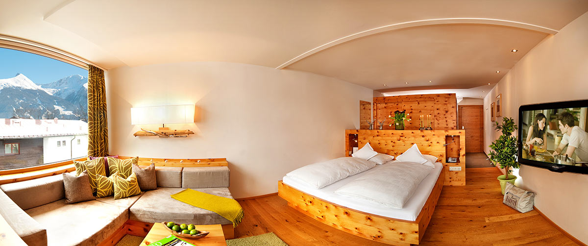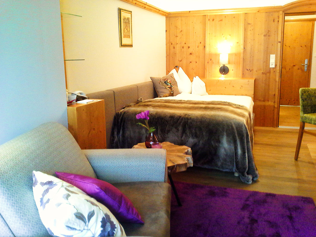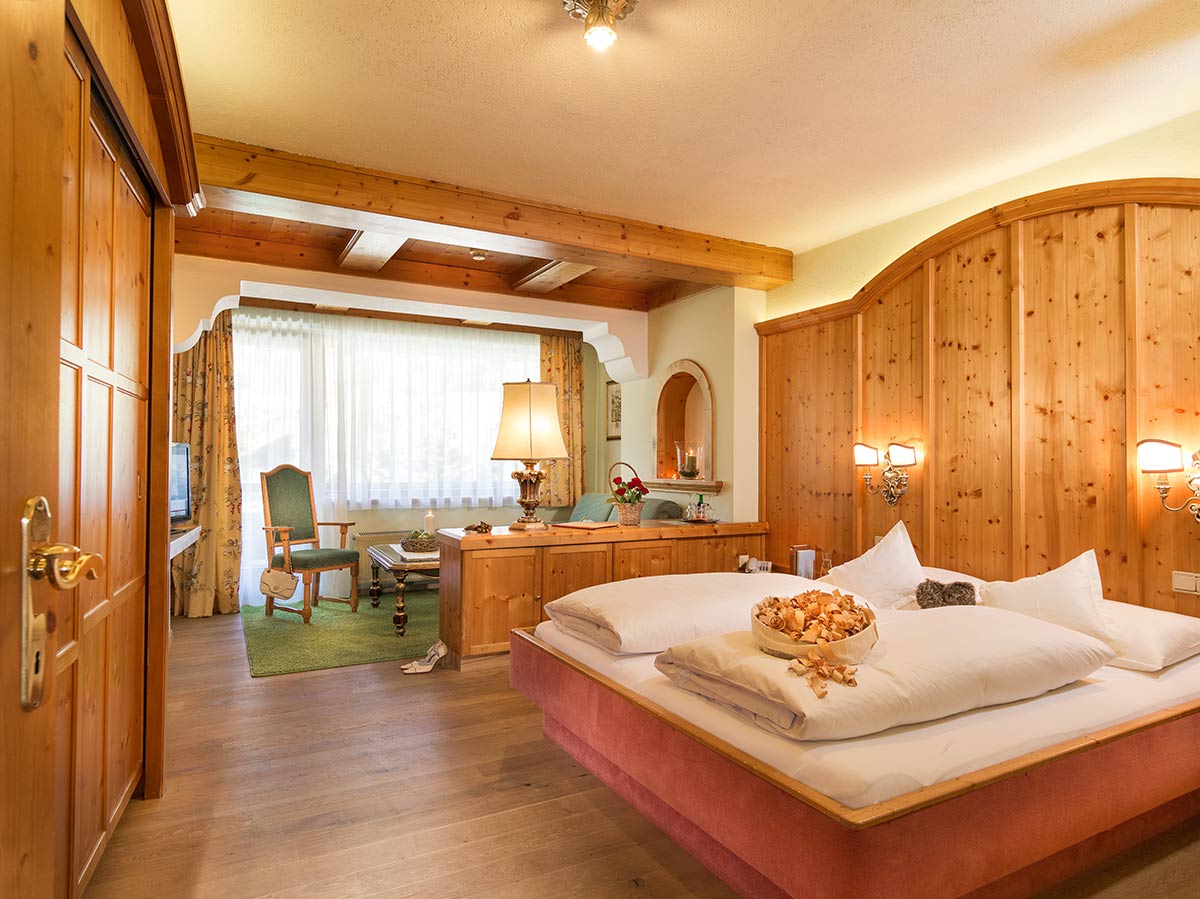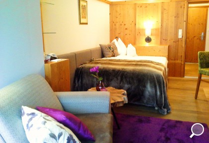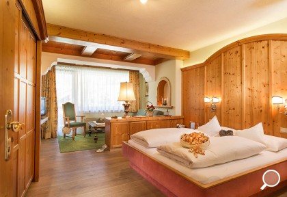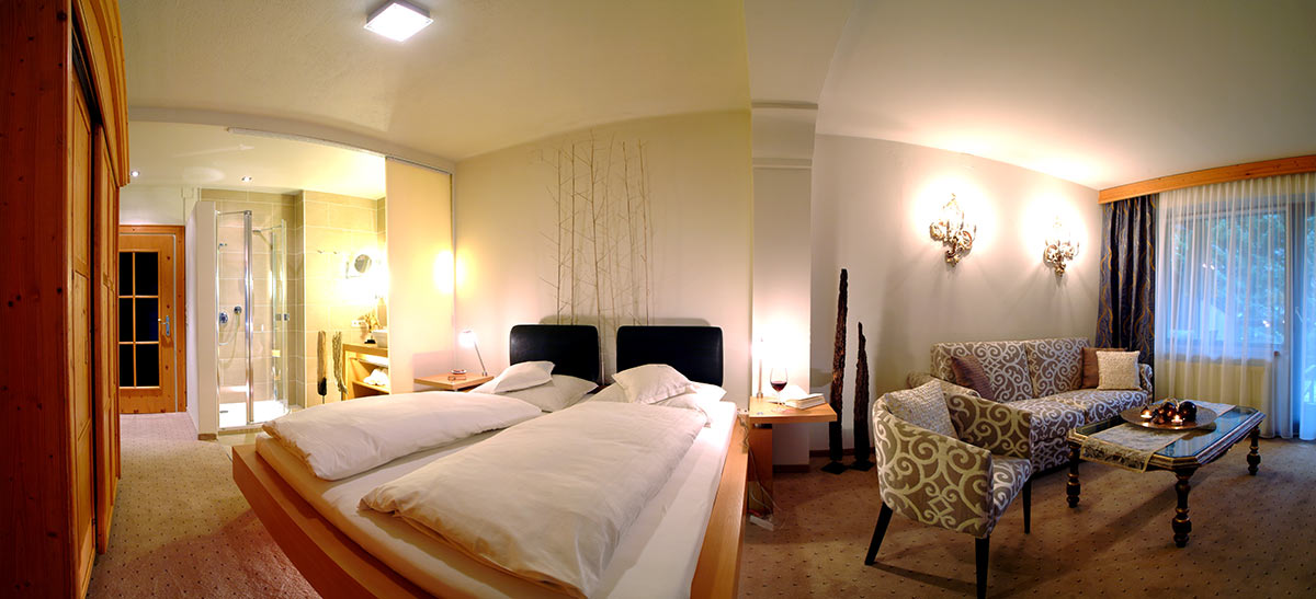Zimmer mit Charme und Raffinesse, wohltuendem Zirbenholz, Vollholzmöbeln, Kuschelecke mit Sofa, Holzboden, offenem Badebereich, kleinem Balkon Richtung Süden, seitlichem Bergblick.