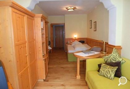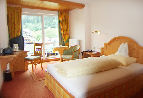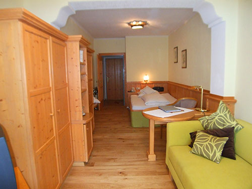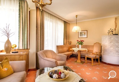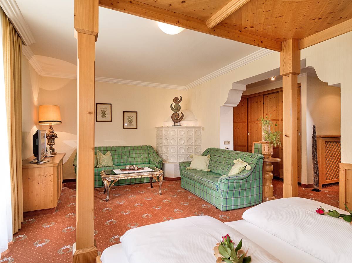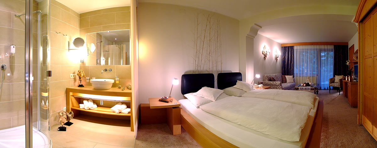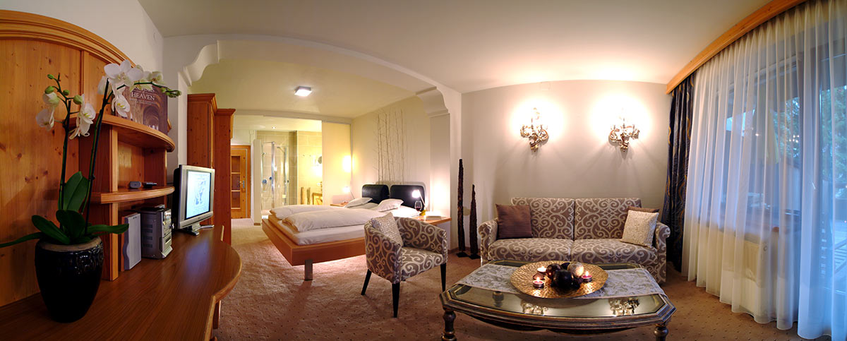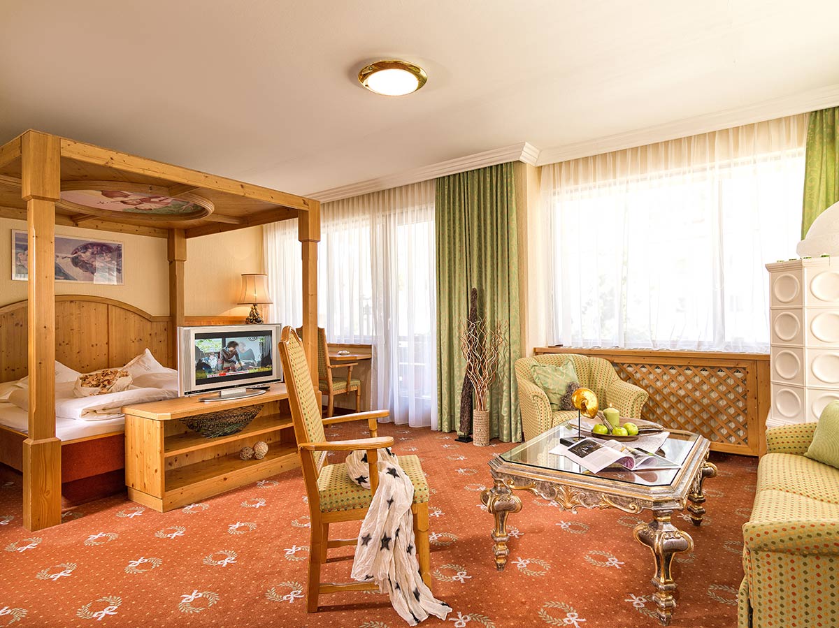 Zimmer mit Charme und Raffinesse, wohltuendem Zirbenholz, Vollholzmöbeln, Kuschelecke mit Sofa, Holzboden, offenem Badebereich, kleinem Balkon Richtung Süden, seitlichem Bergblick.