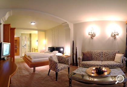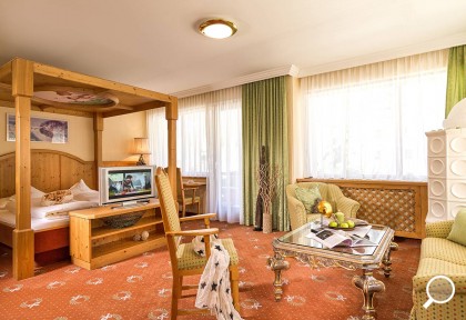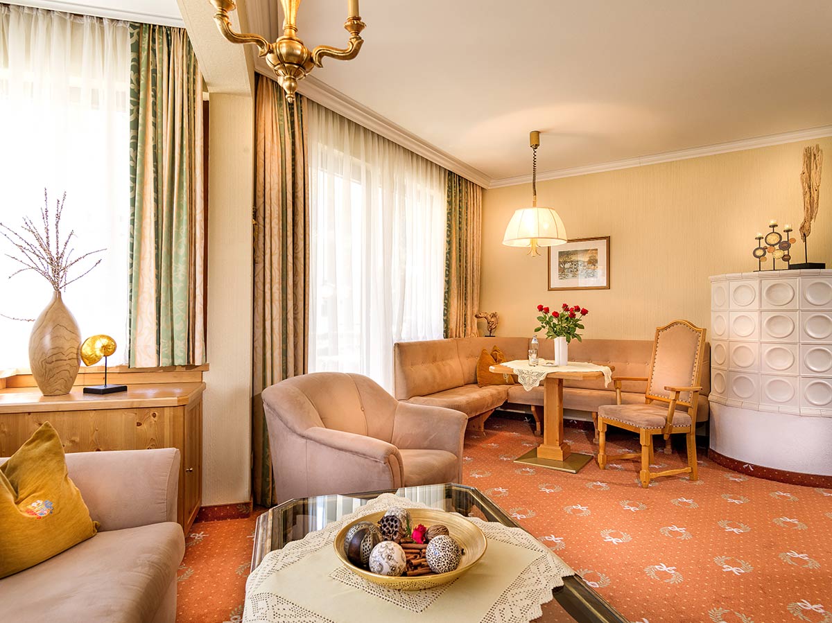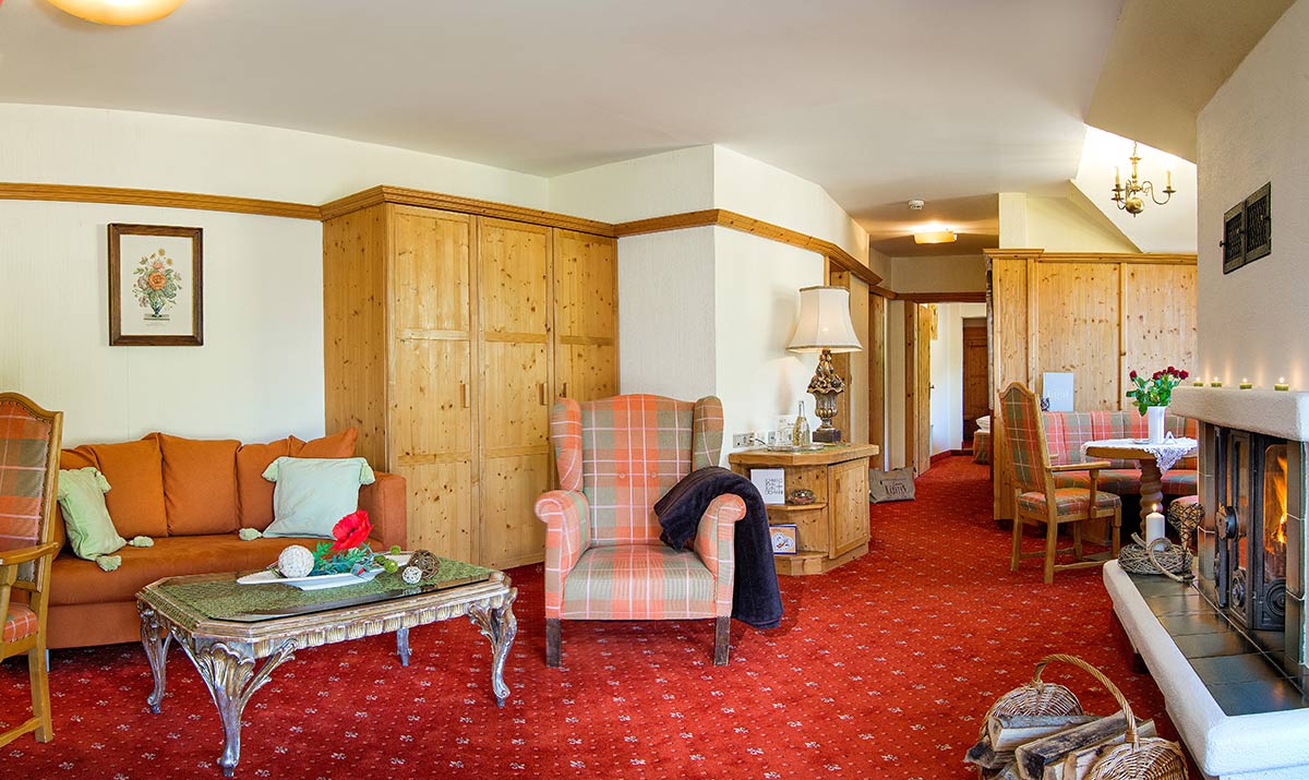 Exklusives Wohnerlebnis in warmen Farben mit Vollholzmöbeln, getrenntem Wohn- & Schlafraum, Badewanne oder Dusche, separatem WC, Minibar, teilweise offenem Kamin, Balkon, teilweise auf zwei Etagen.