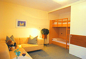 Großzügig präsentieren sich unsere freundlichen Familienzimmer mit getrenntem Wohn- und Schlafraum, Designermöbeln, Stockbett, offenem Kamin, Minibar, Teppichboden, Badewanne und Balkon.