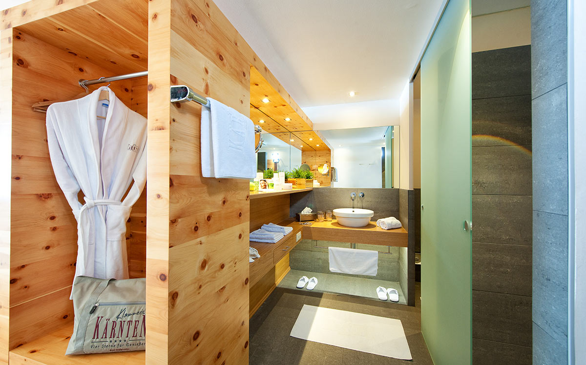 Geräumiges Zimmer mit warmen Farben, Vollholzmöbeln, Kuschelecke mit Sofa, Balkon mit Panoramablick, teilweise Boxspringbetten, Badewannde oder Dusche, Holz- oder Teppichboden.